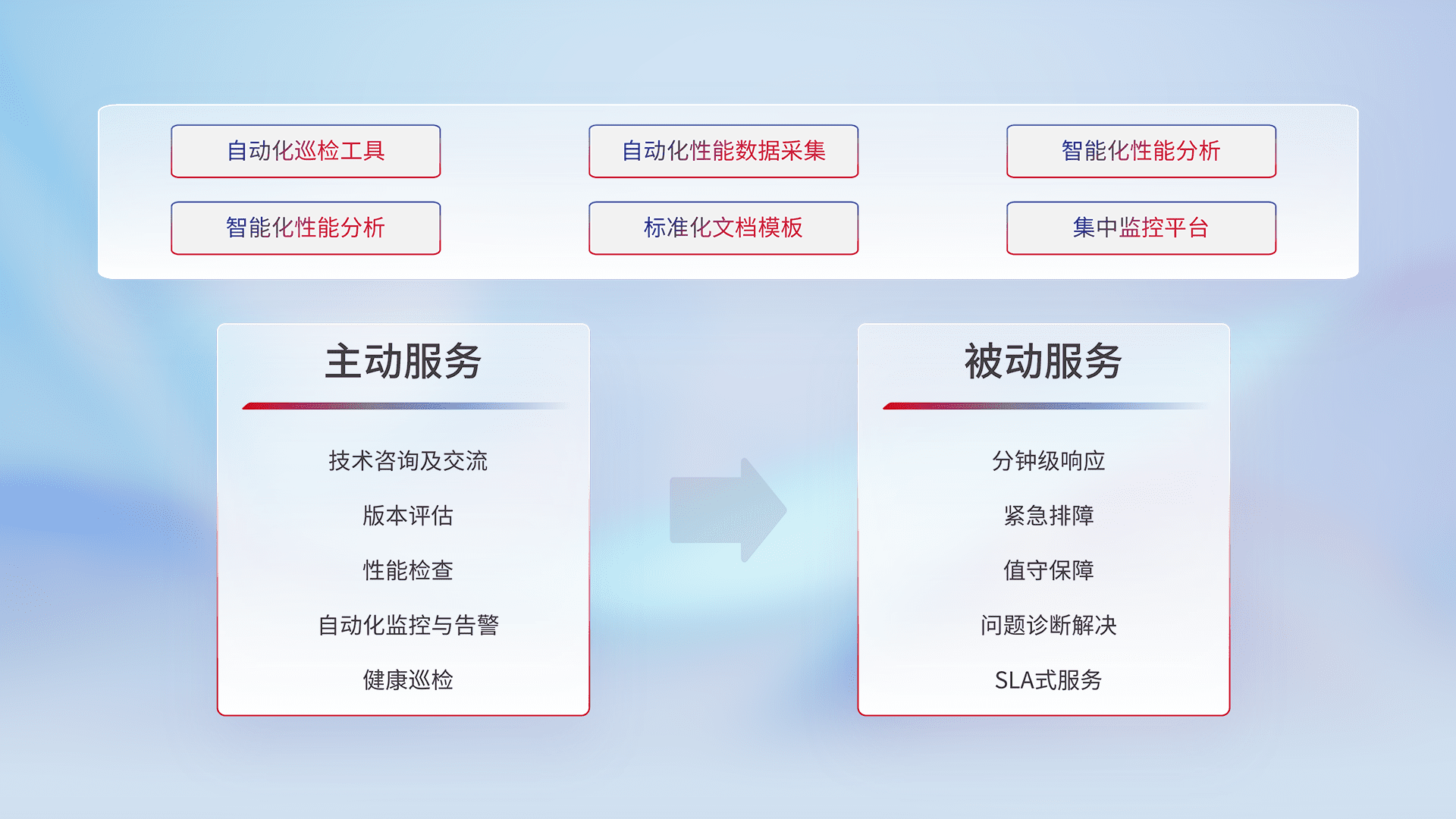 智能化工具和标准化文档,,,保障服务质量,,,,提供主动服务(包含技术咨询、、、版本评估、、、、性能检查、、、、自动化监控与告警、、、健康巡检)和被动服务包含(分钟级响应、、、紧急排障、、、、值守保障、、、问题诊断解决、、SLA服务)。。。。